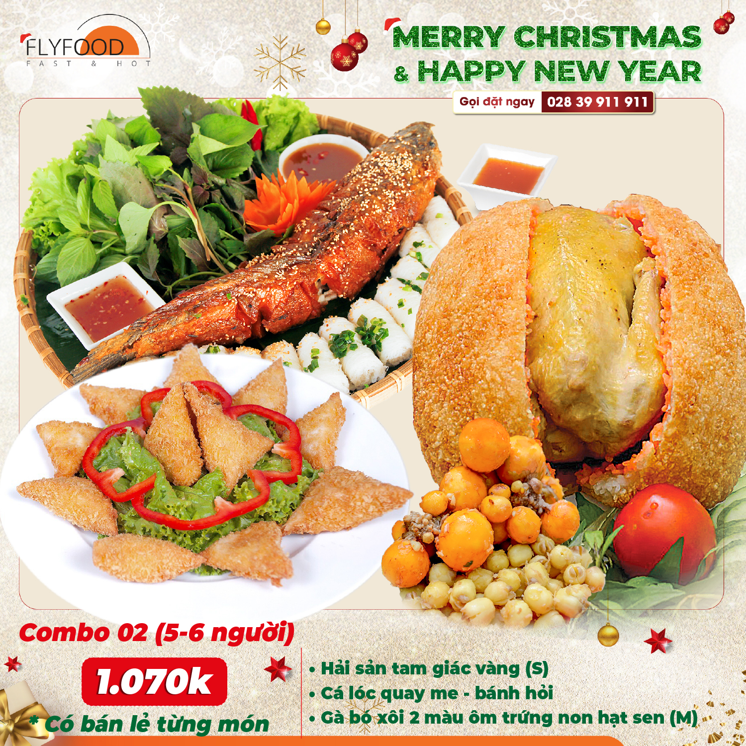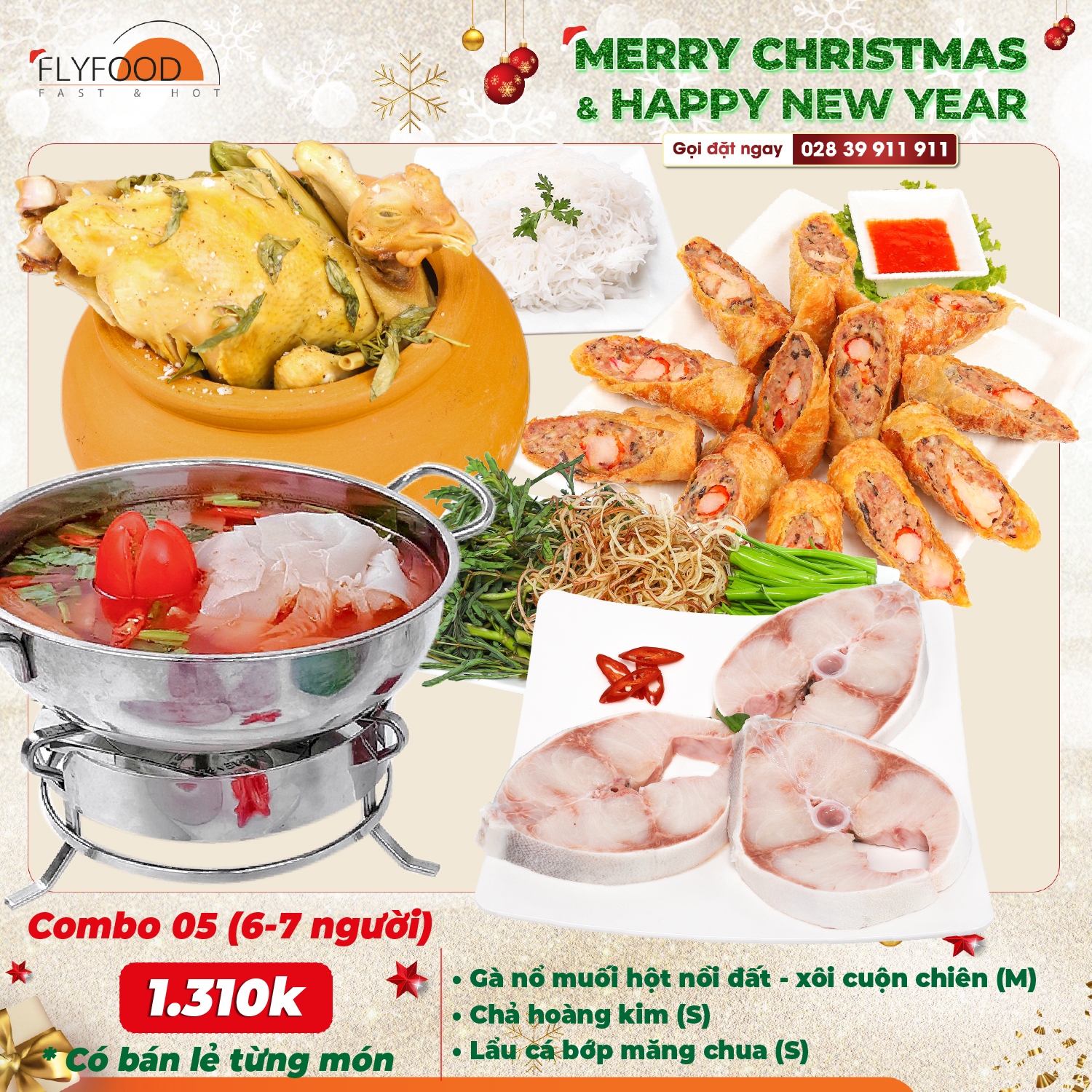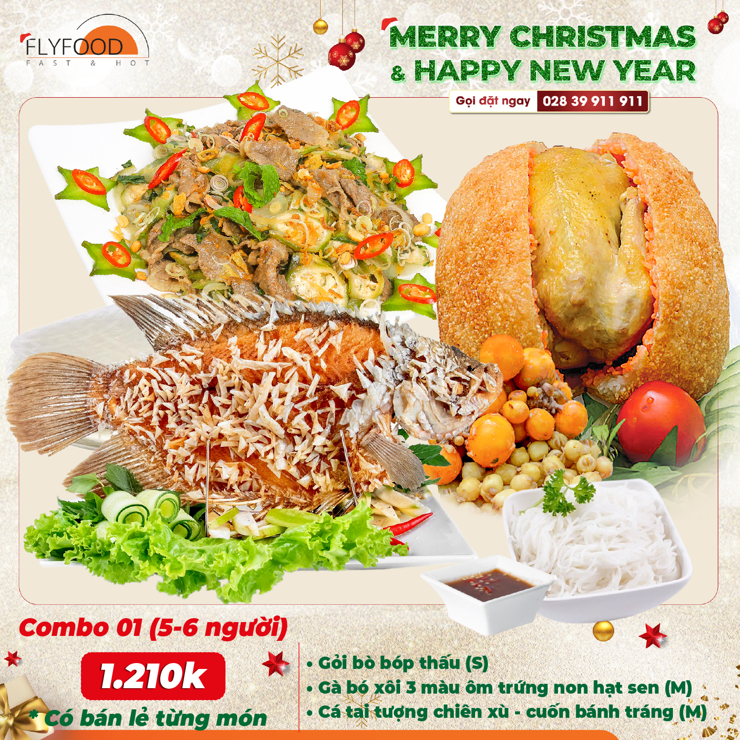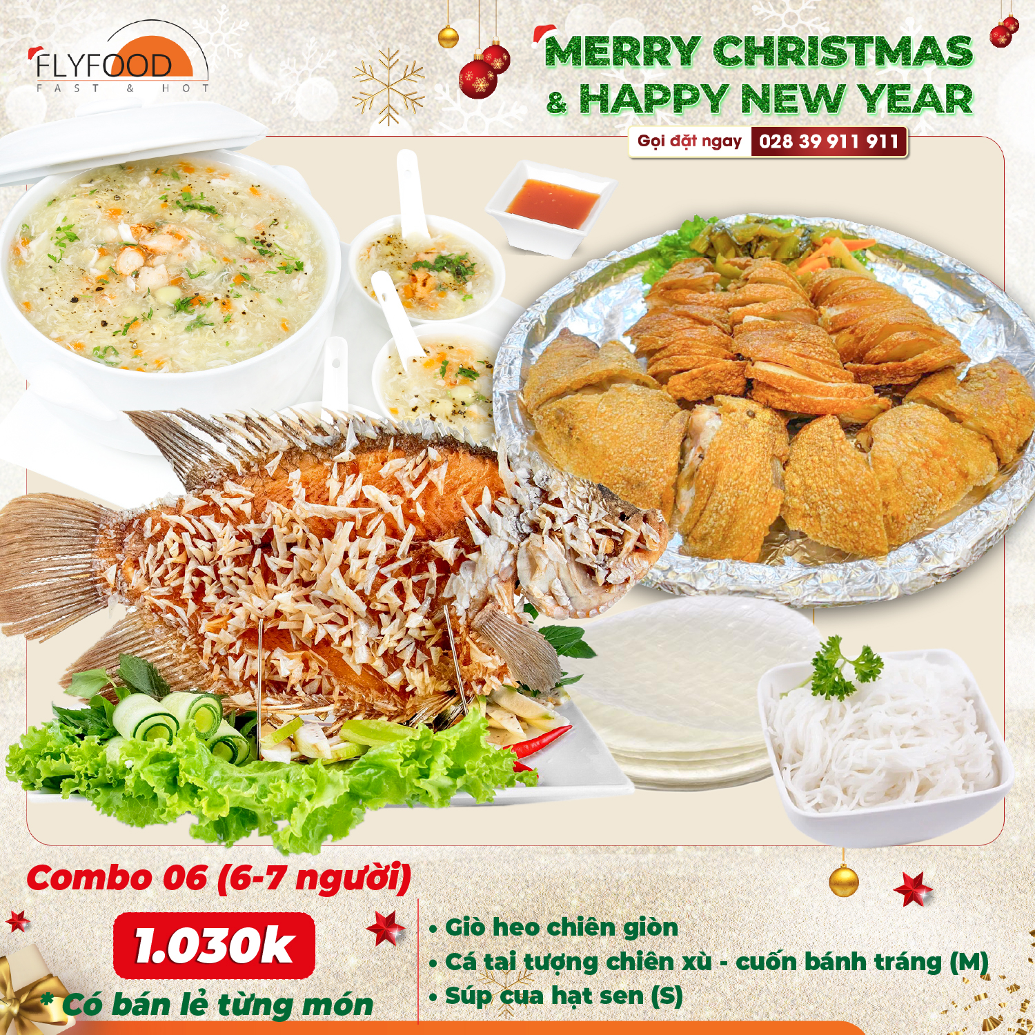 🌟 Tiệc Giáng Sinh và Tết Dương Lịch là những dịp lễ đáng nhớ, mang đến cho mọi người những niềm vui, hạnh phúc và hy vọng. Cuối năm bận rộn, việc tìm kiếm những bữa tiệc Giáng Sinh, Tết Dương Lịch thật trang hoàng, đầy đủ và chỉnh chu thì FLYFOOD hân hạnh là một lựa chọn lý tưởng dành cho bạn. Với nhiều món ăn ẩm thực Việt chất lượng cao, chế biến từ nguồn nguyên liệu tươi ngon và đảm bảo an toàn vệ sinh thực phẩm. Đội ngũ đầu bếp tài năng và chuyên nghiệp, FLYFOOD cam kết mang đến cho bạn những bữa Tiệc trọn gói, Tiệc gia đình vượt trên cả sự hài lòng.