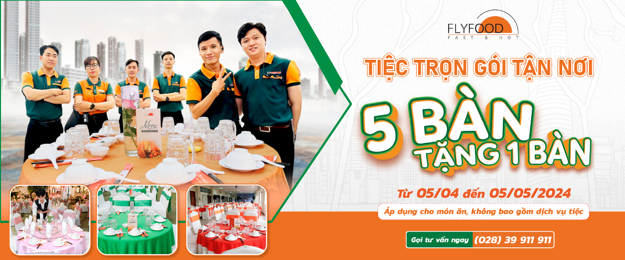 Chào đón tháng 4, FLYFOOD gửi đến quý khách hàng chương trình khuyến mãi sốc khi đặt tiệc trọn gói tại FLYFOOD "5 BÀN TẶNG 1 BÀN".