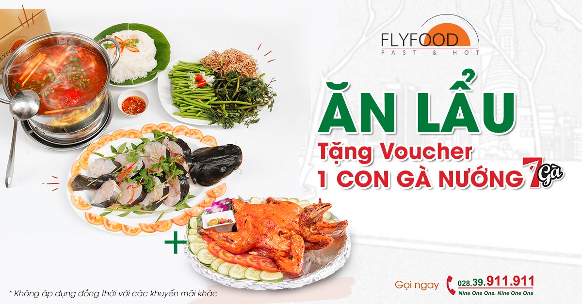 Với các món lẩu, FLYFOOD xin tặng ngay cho quý khách 1 VOUCHER NHẬN 1 CON GÀ NƯỚNG TỪ THƯƠNG HIỆU 7 GÀ - Đệ nhất 7 món Gà nướng Online trị giá 215k. Tại gia đình 7 Gà có 7 vị Gà nướng cho bạn khách tha hồ chọn lựa như: Gà Nướng Mắc Khén, Gà Nướng Riềng Mẻ, Gà Nướng Xí Muội, Gà Nướng Muối Ớt, Gà Nướng Sốt cay, Gà Nướng Sốt Me, Gà Nướng Phô Mai. Cùng công thức tẩm ướp đặc biệt, nguyên liệu đạt chuẩn chất lượng sẽ giúp bạn có những trải nghiệm đáng nhớ bởi những vị ngon đượm đầu lưỡi, đặc trưng chỉ có tại 7 Gà.