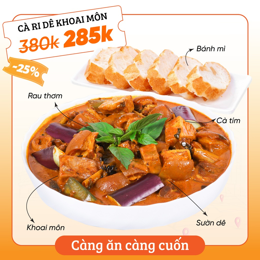 Sử dụng dê tơ, mùi dê đặc trưng kèm với thơm nồng của món cà ri với khoai môn, cà tím và gia vị đặc trưng của nhà FLYFOOD làm cho món Cari Dê Khoai Môn đã ngon càng thêm đậm đà, cuốn hút.