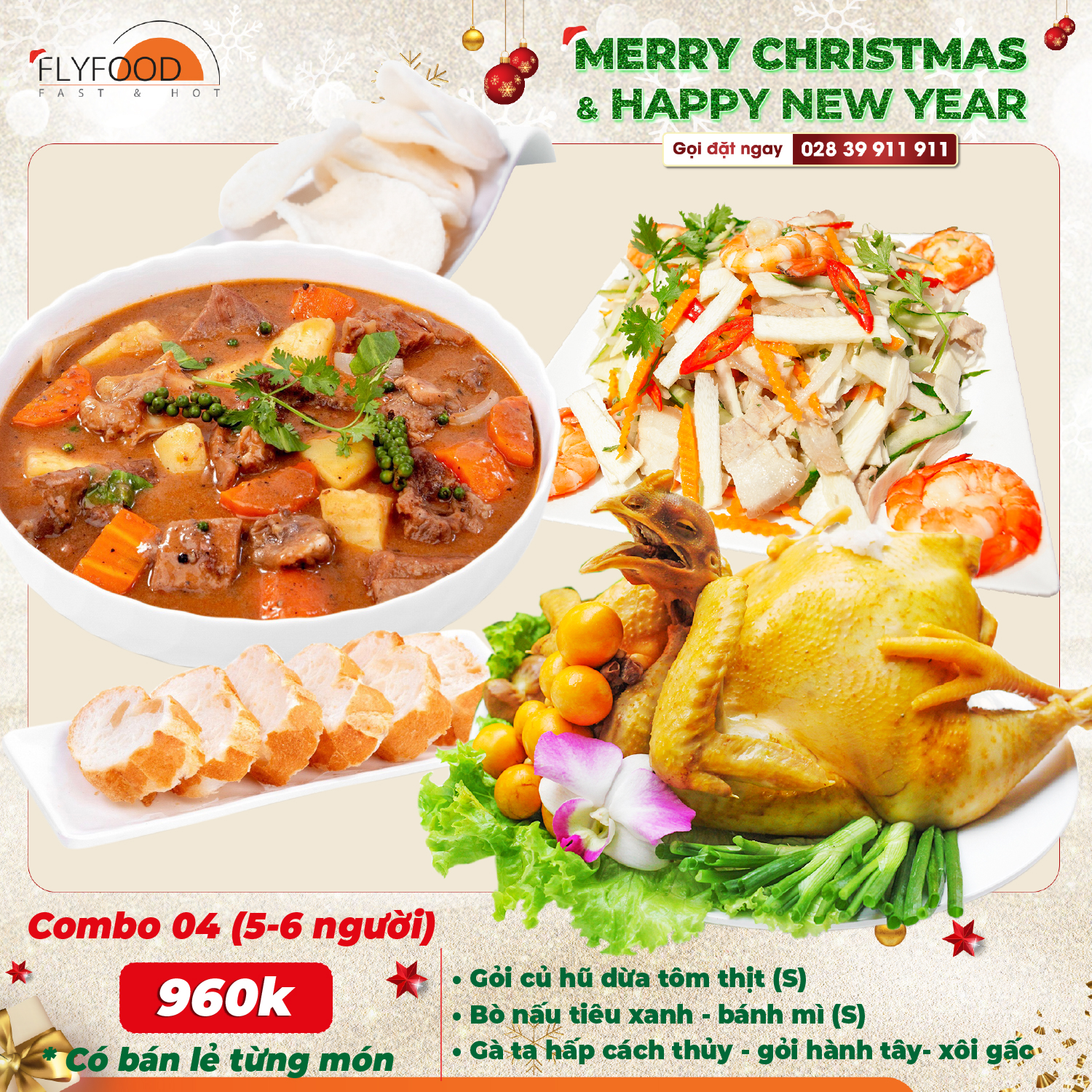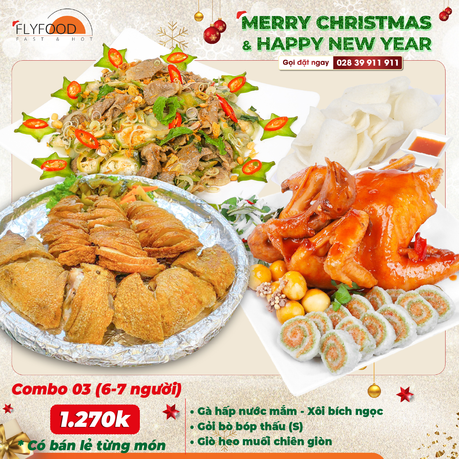 🌟 Tiệc Giáng Sinh và Tết Dương Lịch là những dịp lễ đáng nhớ, mang đến cho mọi người những niềm vui, hạnh phúc và hy vọng. Cuối năm bận rộn, việc tìm kiếm những bữa tiệc Giáng Sinh, Tết Dương Lịch thật trang hoàng, đầy đủ và chỉnh chu thì FLYFOOD hân hạnh là một lựa chọn lý tưởng dành cho bạn. Với nhiều món ăn ẩm thực Việt chất lượng cao, chế biến từ nguồn nguyên liệu tươi ngon và đảm bảo an toàn vệ sinh thực phẩm. Đội ngũ đầu bếp tài năng và chuyên nghiệp, FLYFOOD cam kết mang đến cho bạn những bữa Tiệc trọn gói, Tiệc gia đình vượt trên cả sự hài lòng.